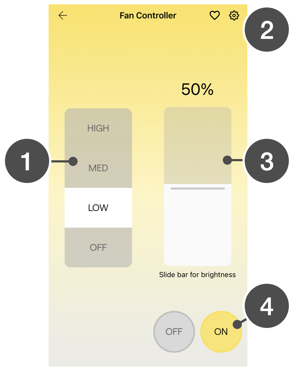 Tap the fan icon to progresses through the following: Low, Med, High, and Off.